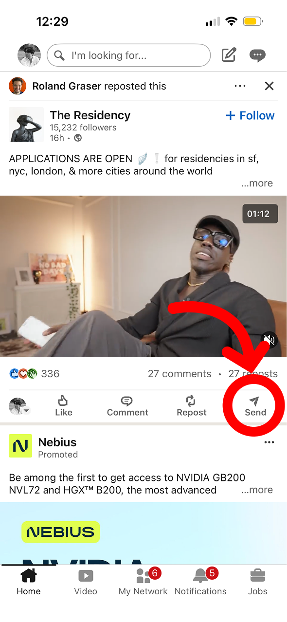 Tap the share icon (arrow) on the post, then tap 'Share via' to open the system share sheet.