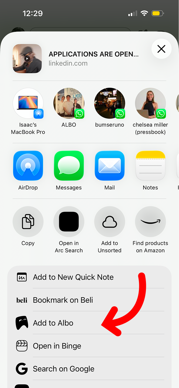 Scroll the share sheet and tap Albo. The post will be saved with its content and details.